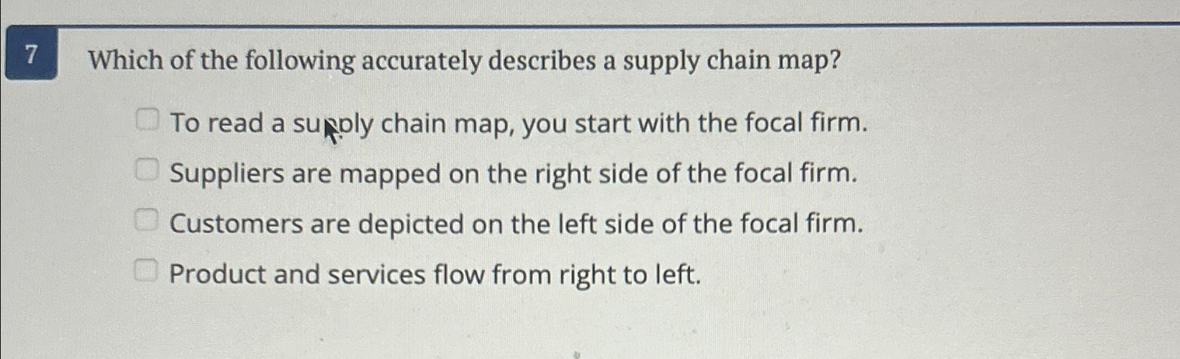 Which Of The Following Accurately Describes A Supply Chain Map Solved Which of the following accurately describe a supply | Chegg.com: Since facilities are not necessarily connected in a serial fashion, despite its name, a supply chain describes a network of connected The course includes the following units: (1) Inventory . This mapping process identifies potential bottlenecks, inefficiencies and areas for improvement within the supply chain. With this knowledge, companies can strategically allocate resources to optimise .